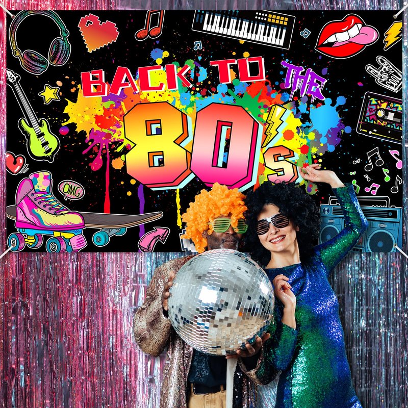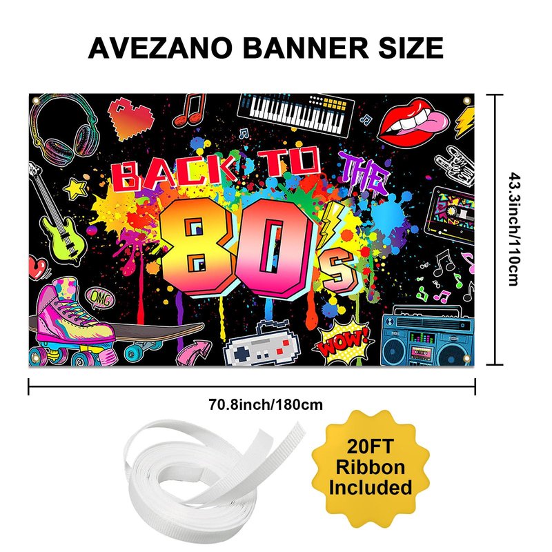 - Easy to Assemble: The retro 80s party background comes with ribbons; Just put it through the grommet at each corner and hang done, which can save time at party decoration; Suitable for indoor or outdoor walls, yard, home, bedroom, playground, garage