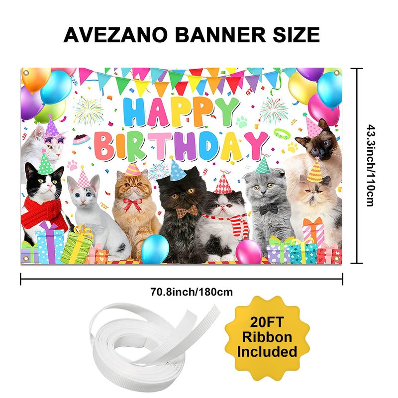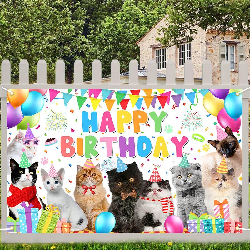 - CELEBRATE IN STYLE: This bright and colorful cat happy birthday banner creates a festive backdrop for photographs; Made of high-quality polyester fabric that will maintain its vibrant colors even after repeated use, with string for easy hanging