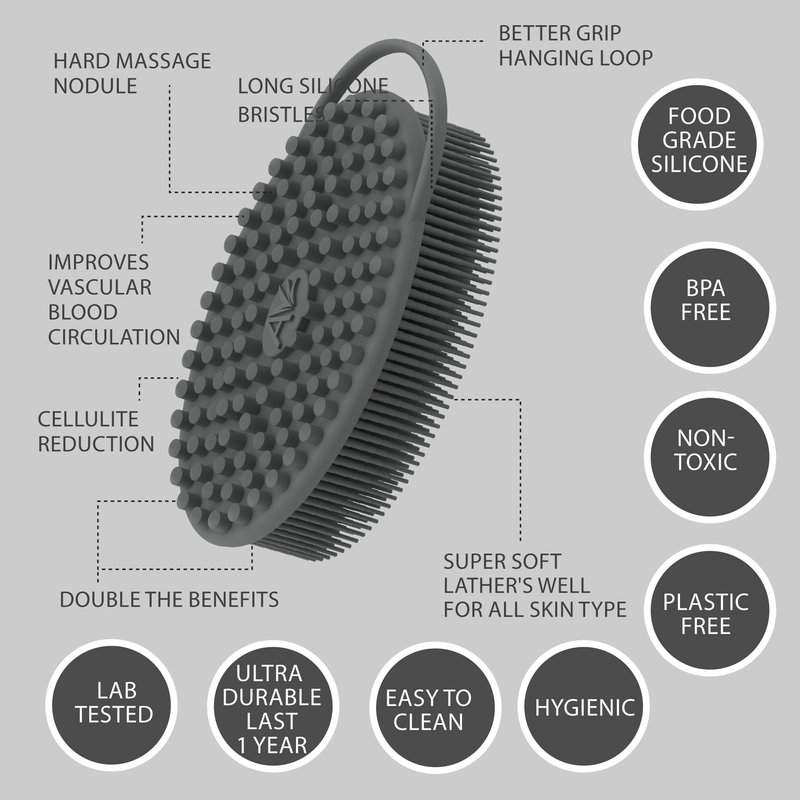 - NOW WITH LOOP HANDLE- For better grip and hangs easily in the shower for better drying. A silicone bath brush is more effective than using your hand, a washcloth, or a bristle brush to cleanse your skin. Silicone is a soft and safe material that can help exfoliate your skin. Rubbing the bristles into your skin stimulates blood circulation and can reduce cellulite in problem areas.
