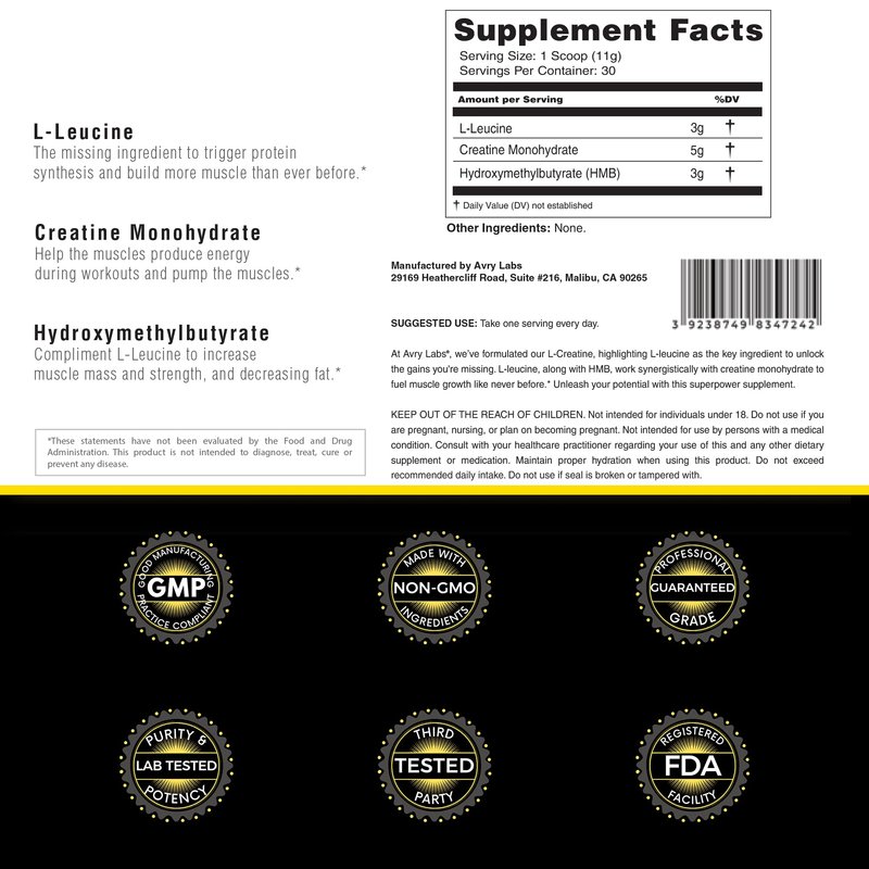 For the first time ever, Creatine Monohydrate is combined with L-Leucine, the most powerful amino acid — often overlooked — and difficult to get enough of with diet alone. Also containing HMB, which works synergistically with both leucine and creatine to build muscle much faster and better than with creatine alone. L-CREATINE is the most perfectly-dosed supplement for increasing anabolic hormones in the body. It is uniquely blended with Creatine Monohydrate, L-Leucine and HMB to work together to increase muscle mass, speed muscle recovery, increase performance, and decrease body fat. Creatine monohydrate works by inducing the process of osmosis, which draws water into the cells of the muscle and increases the production of ATP, which is the body’s primary energy source. L-Leucine and HMB work by stimulating protein muscle synthesis via the mTOR pathway, which turns on when leucine is added in the body, as it cannot be produced naturally without supplementation. HMB is a natural by-product of leucine production that is a strong ergogenic aid in increasing muscle mass and strength and decreasing fat. L-Creatine Monohydrate is designed to help you maximize your workouts and get the most hardcore results naturally. Crafted with nutritional expertise and validated by scientific research, Avry Labs propels your commitment to a healthy lifestyle and bodybuilding goals. Our groundbreaking nutrition and diet supplements are specifically formulated to increase testosterone, aid in recovery, boost endurance, shed fat, and grow muscle size and strength.