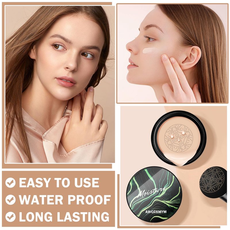 AWCCXMYM CC Cream Cushion Foundation Full Coverage Foundation Matte Moisturizing Concealer BB Cream Foundation Makeup with Mushroom Head for Glowing Flawless Skin Radiance 01#Ivory (Porcelain)