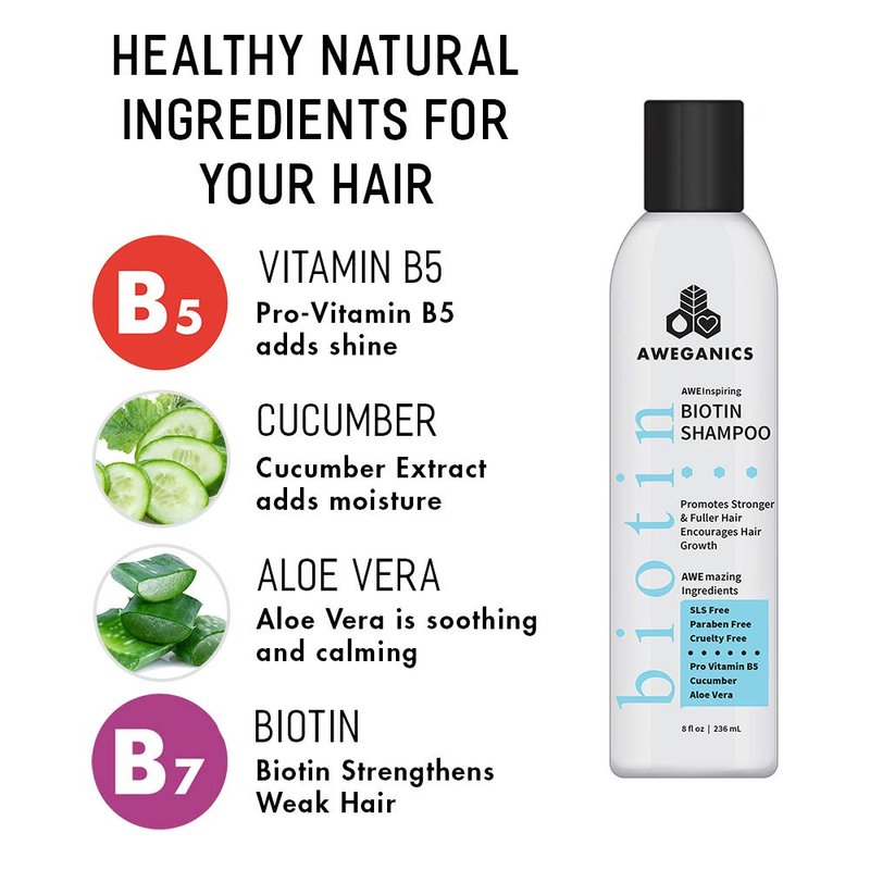 - BIOTIN SHAMPOO FOR HAIR GROWTH - Grow longer, stronger, and thicker hair with our natural biotin shampoo that rebuilds your hair from the inside out. Presence of natural elements in our hair nourishing shampoo replenishes moisture promoting healthy hair growth. Professional moisturizing shampoo packed with the ingredients like Pro-Vitamin B5, cucumber and aloe vera promotes hair growth for long, shiny, and strong hair of your dreams. Our hair biotin shampoo is free from parabens, and sulfates