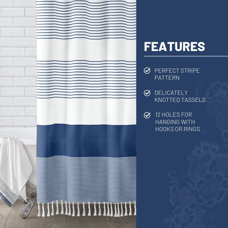 Awellife Navy Blue Shower Curtain for Bathroom Stripe Tassel Shower Curtain 72 X 84 Inches Farmhouse Linen Long