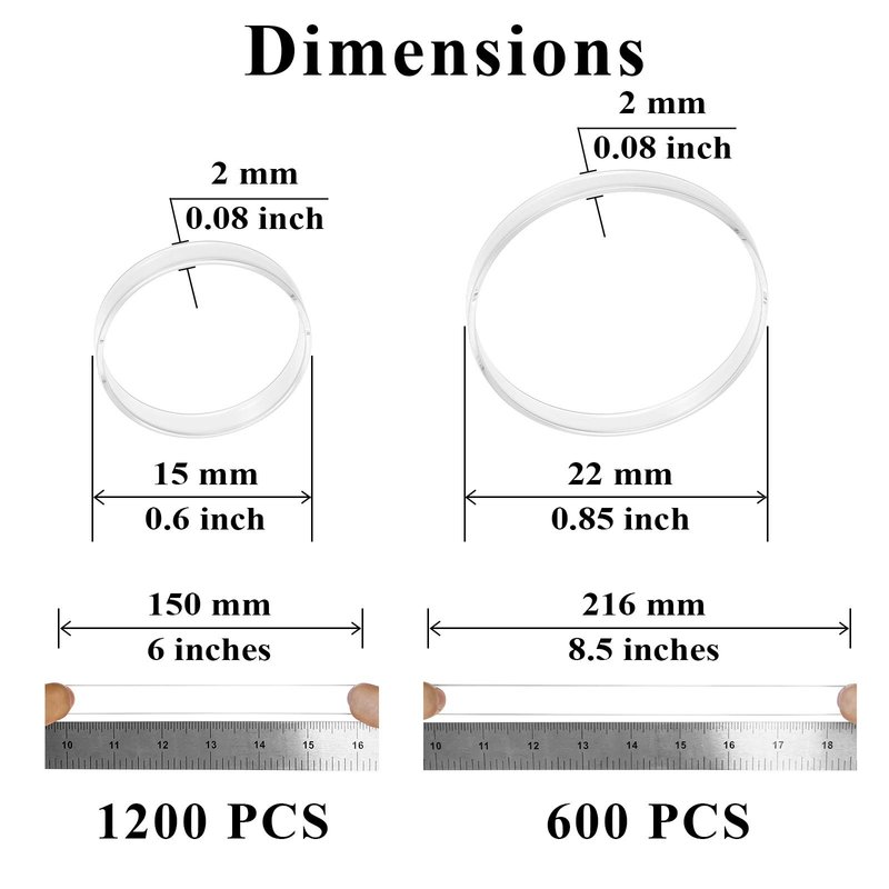 - AwEx Clear Elastic Bands, two sizes included,quantity of larger size 600 PCS and smaller size 1200 PCS,the larger size with loop diameter 1 inch and band width 0.08 inch; the smaller one with loop diameter 0.6 inch and band width 0.08 inch;