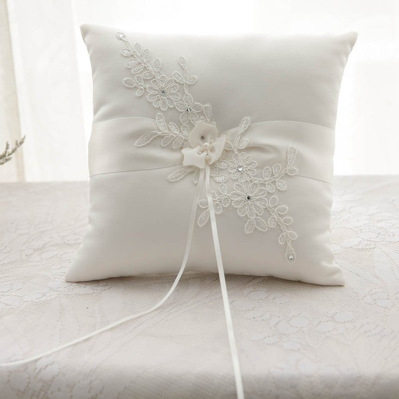 - Ivory ring pillow decorated with satin ribbon and pearl