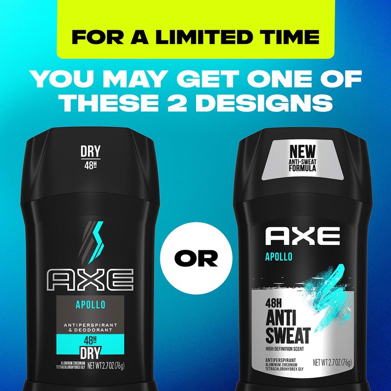 - AXE Antiperspirant Deodorant Stick for Men, Apollo, 2.7 oz provides 48-hour odor and wetness protection to keep you confidently fresh and dry for longer