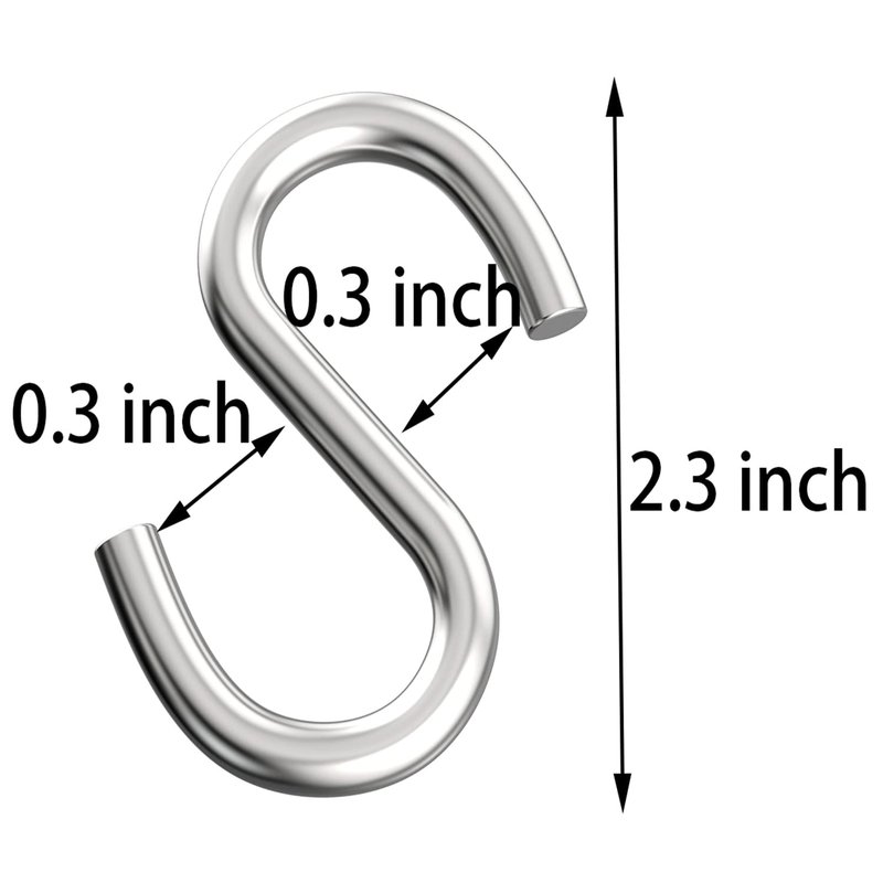 - S shaped Hooks Size: hooks are approx 2.3 inch in total length, line thickness is 5 mm, hook end opening is 0.5 inch wide and hook loop diameter is approx 0.8 inch.