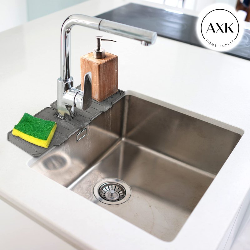 - SINK INTO A DRY COUNTERTOP with the AXK Home Supply sink mat for faucet. This faucet drip catcher collects all of that kitchen sink backsplash and redirects it right back to your sink for easy and simple splash management. PLEASE MEASURE YOUR FAUCET & SINK SIZE BEFORE PURCHASE