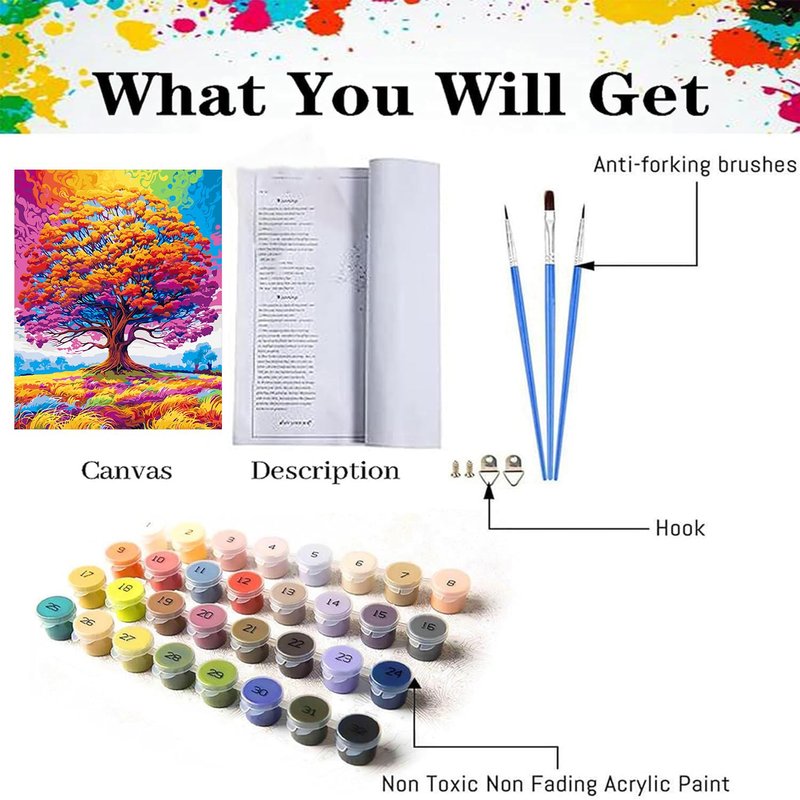 - What You Get - With tree of life paint by numbers for adults, you will get: 1 high-quality, soft, waterproof canvas, 1 set of perfectly matched acrylic paints,1 set of high-quality brushes (including 3 different size brushes), 2 sets of hooks, 1 instruction and reference pictures of finished products.