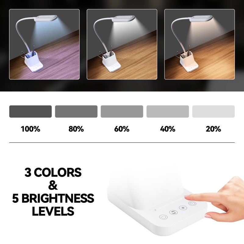 - 3-in-1 Flexible Gooseneck Desk Lamp: Features USB Charging Port/Pen Holder/Photo Mount, charging your smartphone and keeping your small space organized.