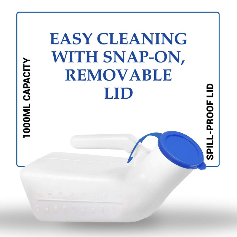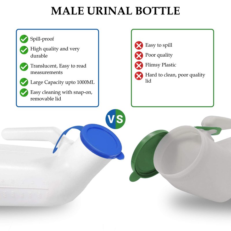 - ✅ TRANSLUCENT AND SPILL-PROOF - The urinal caps are very precisely made to make the urinals spill proof and easy to open and close. The firm Snap-On cap doesn’t let the liquid spill over. Translucent plastic material makes it easier for you to know if the bottle is already full or not.