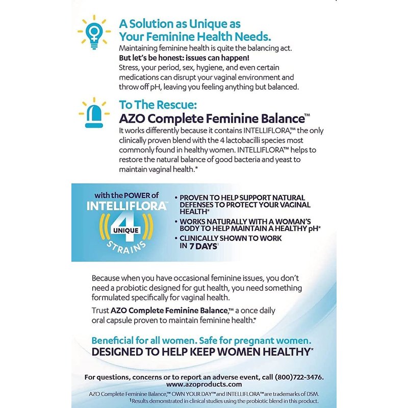 - NATURALLY-SOURCED INGREDIENTS: AZO Complete Feminine Balance contains Intelliflora, a multi-strain probiotic blend that is clinically proven to work in 7 days