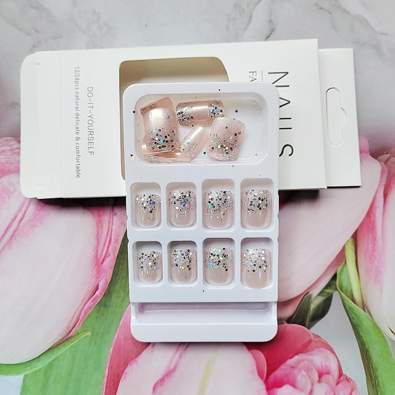 - 【Press on Finger Nails Easy to Use】Instead of spend lots time and money at nail salon, you can change you nails style in 15 min anytime and anywhere.(The glitter powder fake nails will stay longer if you clean your nails before use, and avoid water within the first hour of wearing)