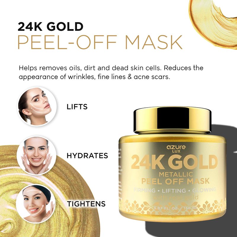 AZURE 24K Gold Metallic Sparkling Peel Off Face Mask - Lifting, Illuminating & Revitalizing | Removes Blackheads, Dirt & Oils | Reduces Wrinkles & Fine Lines | - 150 mL / 5.07 Fl Oz
