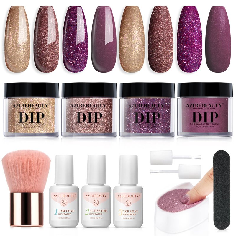 - 【12Pcs Complete Dip Powder Nail Kit】 AZUREBEAUTY 2024 dip nails powder starter kit includes 4*10g all with flash nail dip powder set with light brown glitter、deep brown glitter、light purple glitter、deep purple glitter, 3*10ml liquid set (base coat/activator/top coat), 2*liquid brush replacement, 1*nail brush,1*nail file, 1*dip powder recycling system, User Manual Quick Start Guide