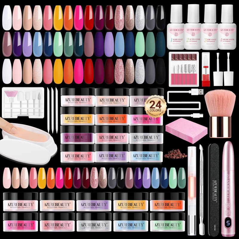 - 【92Pcs Complete Manicure Kit】 AZUREBEAUTY dip nails powder starter kit includes 24*0.16 oz gorgeous colors of nail dip powder, 4*0.33 oz dip powder liquid set(base coat/activator/topcoat/brush saver), 1*Portable Electric Nail Drill, 11* drill bits, 10 *table mat, 1*Ceramic Corn Head, 1*type-c charging cable, 30*sanding band, 1*cuticle oil pen, 3*nail sticks, 1*nail file, 1*dust brush, 1*recycling tray, 2*liquid replacement brush, 1*storage bag; and user manual quick start guide