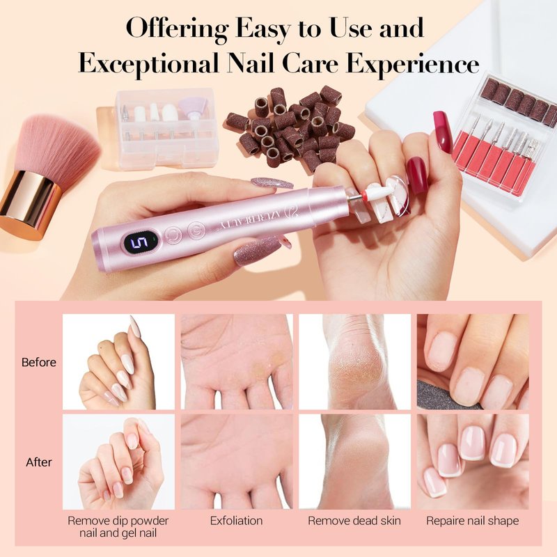 - 【Multifunctional Nail Drill】 With 5 adjustable speeds (0-20000rpm), 11 different nail drill bits, pause function, and F/R direction function for use with both hands. Cordless design, compact and lightweight, intelligent LED digital display, with lighting, more convenient to use and carry. Using new technology, long endurance, low noise, low heat, and low vibration, brings a more comfortable experience. It can handle cuticle removal, polishing, grinding, removing gel, dip powder, and acrylic