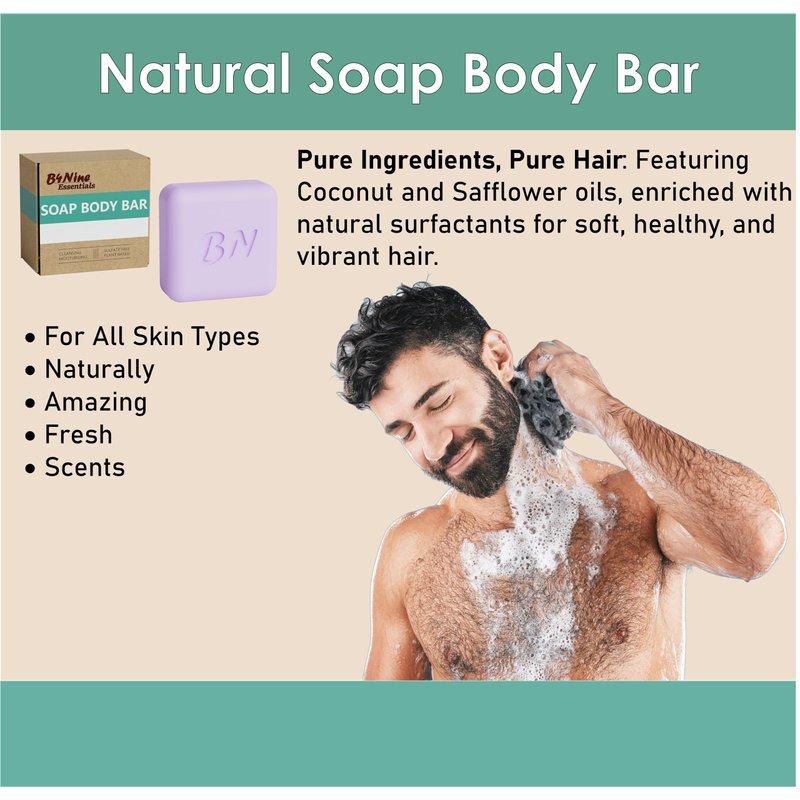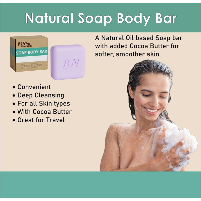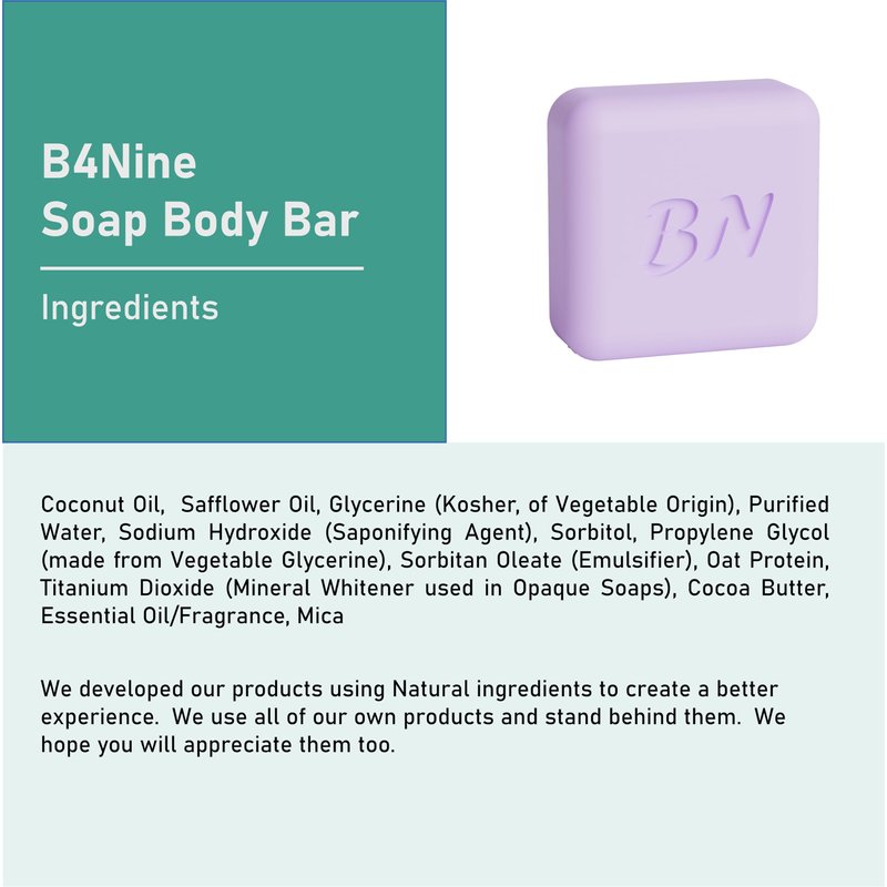 Experience the pure indulgence of our B4Nine Natural Soap Bar, expertly crafted to transform your daily cleansing routine into a rejuvenating spa experience. Each bar is made with the finest natural ingredients, chosen for their skin-loving properties. Our soap provides a deep, nourishing clean that leaves your skin feeling soft, refreshed, and beautifully hydrated. Perfect for all skin types, this soap bar blends the therapeutic qualities of coconut oil with the deep moisturizing effects of cocoa butter to rebalance and renew your skin. Embrace a luxurious lather that not only cleanses but also enriches your skin with every wash.