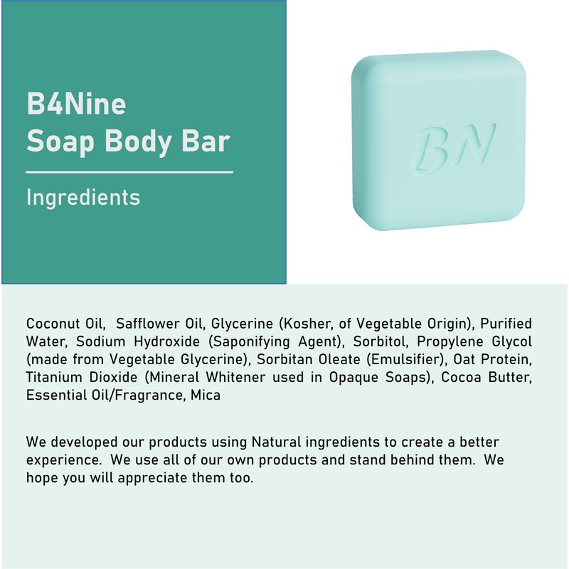 Experience the pure indulgence of our B4Nine Natural Soap Bar, expertly crafted to transform your daily cleansing routine into a rejuvenating spa experience. Each bar is made with the finest natural ingredients, chosen for their skin-loving properties. Our soap provides a deep, nourishing clean that leaves your skin feeling soft, refreshed, and beautifully hydrated. Perfect for all skin types, this soap bar blends the therapeutic qualities of coconut oil with the deep moisturizing effects of cocoa butter to rebalance and renew your skin. Embrace a luxurious lather that not only cleanses but also enriches your skin with every wash.