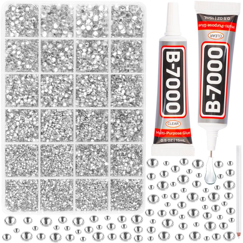 - Flatback Rhinestones for Crafts Rhinestone Kit- ⚪20100PCS flatback shiny bright crystal and diamonds silver clear white rhinestones 5 sizes round assorted 2,3,4,5,6mm (ss6,ss10,ss16,ss20,ss30 assortment), 2X15ml b 7000 jewelry bead glue for jewelry making, wax pencil picker. The colorful multi size rhinestones with glue bedazzler kit with rhinestones are easily for metal and stone beads crafting, jewelry making, DIY nails art & crafts clothing, clothes decor, fabric or decoration.