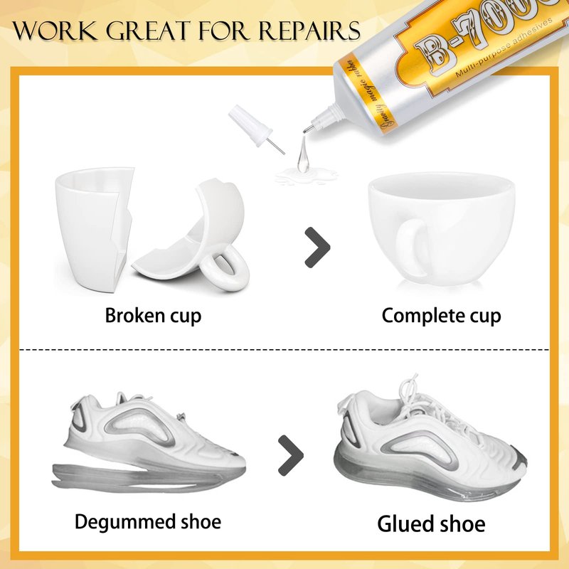 - ✅Suitable for Craft Projects & Detail Works ✅Went on smooth, easy clean up, clog free tip, B-7000 super glue fits most of material like wood, glass, fabric, ceramic, gems, metal, stone, plastics, rubber, silicone and acrylic. They usually use for replacing/ adhere cell phone screen /backs, repairing broken glasses, glue in 3d printed resin minis key places and some detail works, also used for rhinestone gems crystal stones gel on bags, nails, clothes, toys and any other DIY Crafts projects.