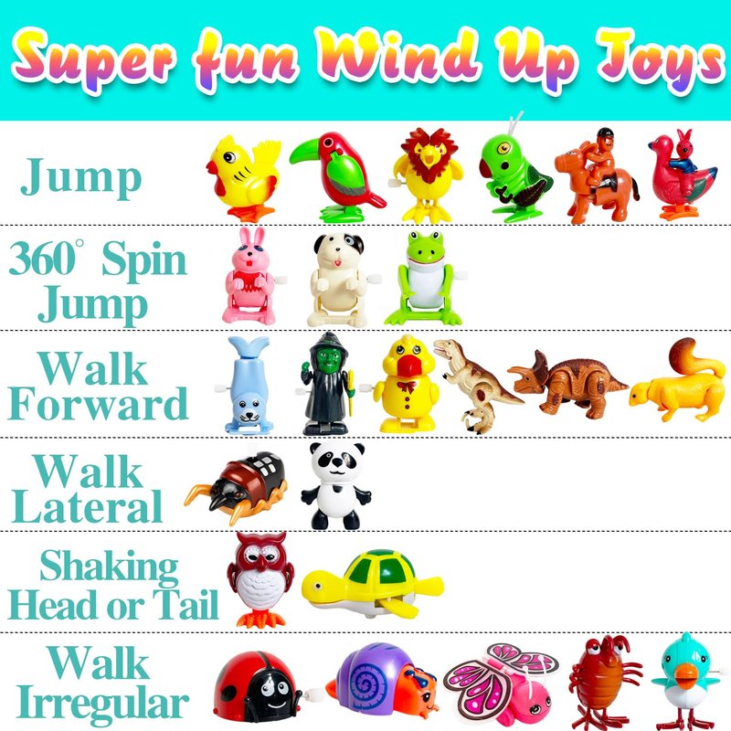 - Value Pack:You'll find 24 wind-up toys,each with their own unique design style.This collection contains a variety of whimsical creatures including a flipping frog,upside down monkey,upside down sea lion,witch,walking panda,cute puppy,hen,ship,charming butterfly,dinosaur,crawling snail and many more wind-up toys worth exploring