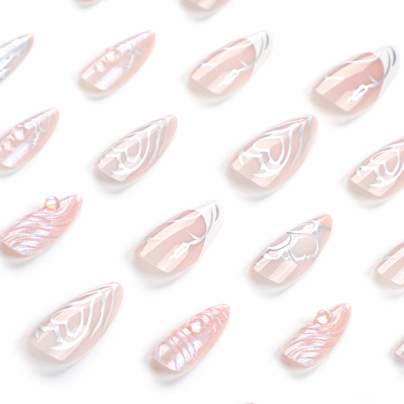 BABALAL Almond Press on Nails Medium Fake Nails White French Tip Glue on Nails 3d Texture Water Wave Acrylic Nails Cute Ball Sliver Chrome Heart Design 24Pcs Stiletto Manicure False Nails