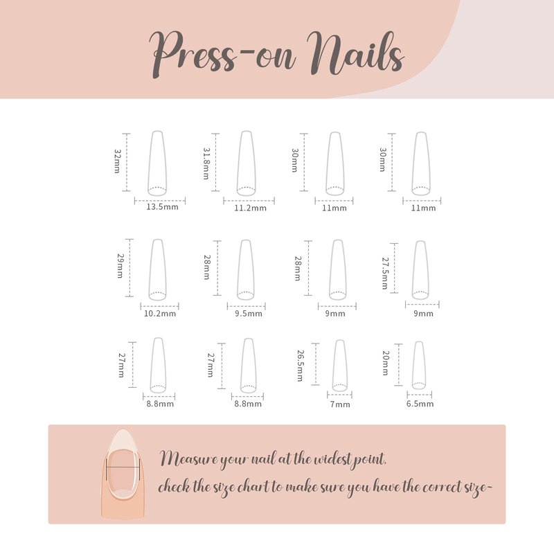 - 【Different Sizes】24pcs coffin fake nails with design in many different sizes. According to the size and width of your nails, you can choose the most suitable fake nails for your own