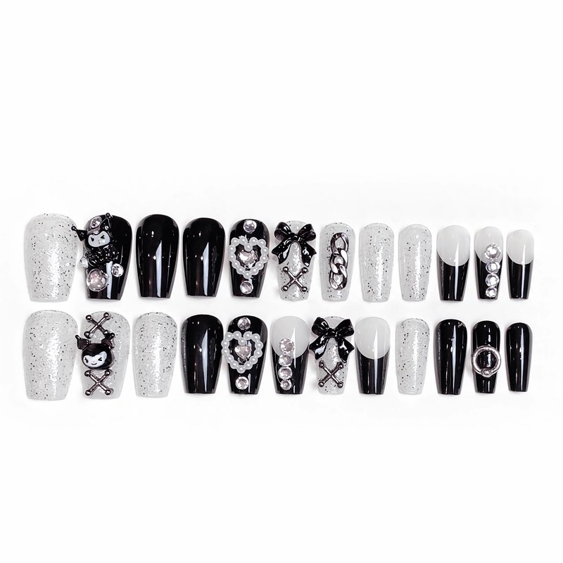 BABALAL Press on Nails Medium Coffin Fake Nails Black French Tip Glue ons Nails Cute Bow Anime Heart Charm Design Acrylic Nails 24Pcs Luxury Bling Ballerina Manicure DIY False Nails