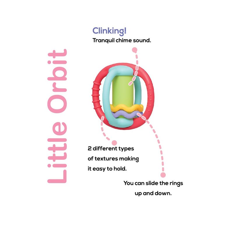 Ideal for holding with two hands for midline play, the Little Orbit teething toy helps reduce fussiness and discomfort via multiple sensory points and texture. The bright and cheerful colors are adorable and shaking sound is unique to help raise body awareness. Exploring the soft rings in the middle with tiny fingers to promote fine motor skills. As a family run company, we strive to enrich the special bond between parent and child through playful learning. We care enormously about the safety and quality of our products. We always use the best, safe, top-quality components which are BPA, Phthalate and Lead-free. We double check every element of our products before they are shipped to stores. All of our products are tested and certified in multiple major markets and conform to CPSIA, ASTM and Japan ST Mark.