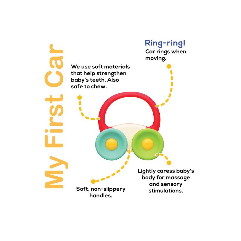 - 𦷠TEETHING RELIEF: Soothe your little oneās gums with multiple sensory points and textures. My First Car is a safe and fun way to reduce fussiness and discomfort.