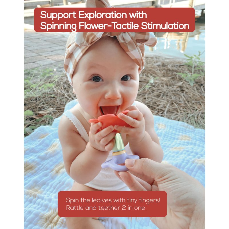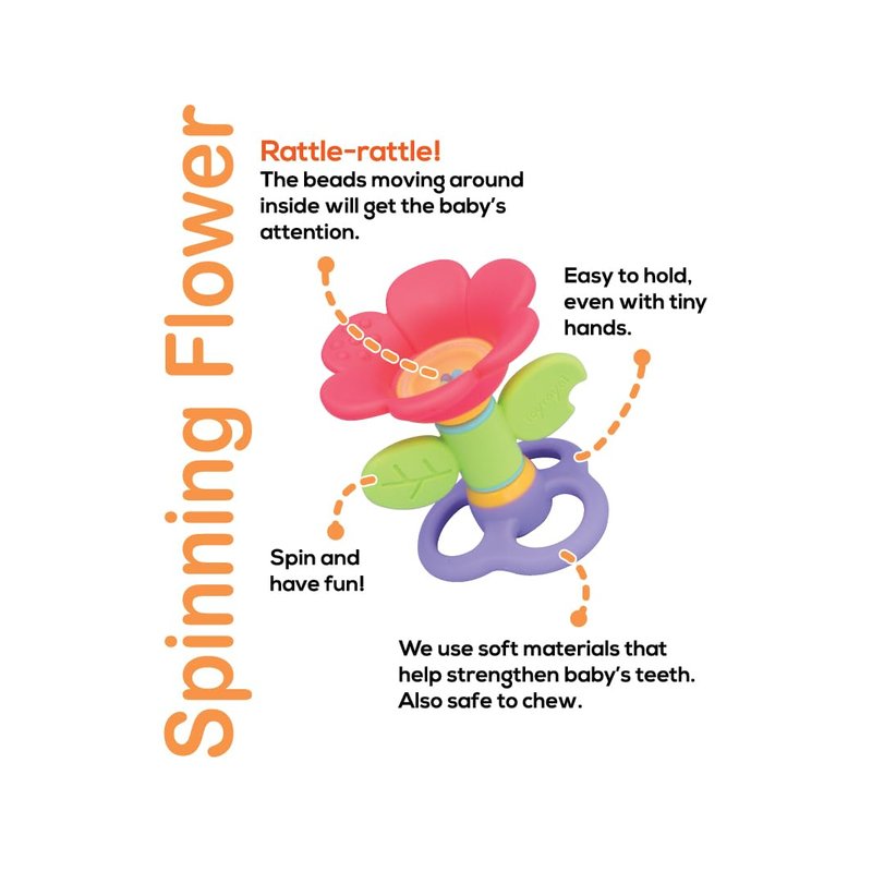 - 𦷠TEETHING RELIEF: Soothe your little oneās gums with multiple sensory points and textures. The Spinning Flower is a safe and fun way to reduce fussiness and discomfort.