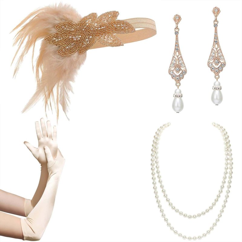 BABEYOND 1920s Flapper Accessories Gatsby Costume Accessories Set 20s Flapper Headband Pearl Necklace Gloves Plastic Holder