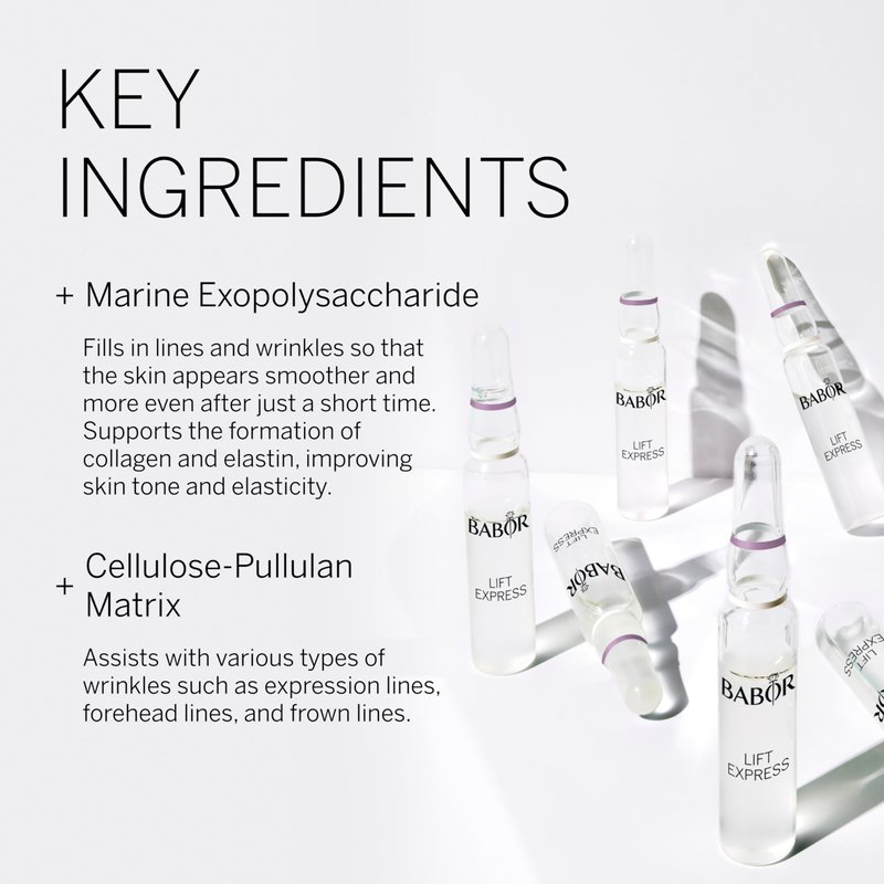 Lift Express Ampoule Concentrates were designed for a quick Òlifting effect.Ó Ampoule Serum supports mature skin and provides more tone and elasticity. In addition, the ampoules soften wrinkles and provide a youthful appearance.