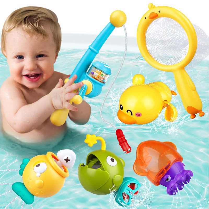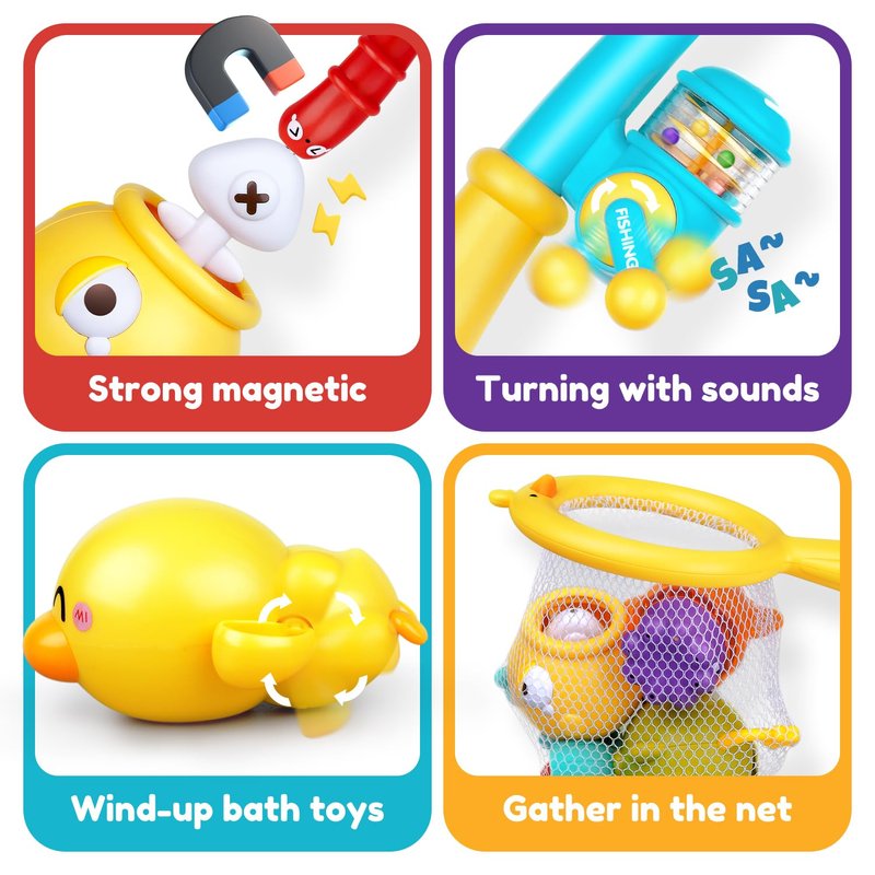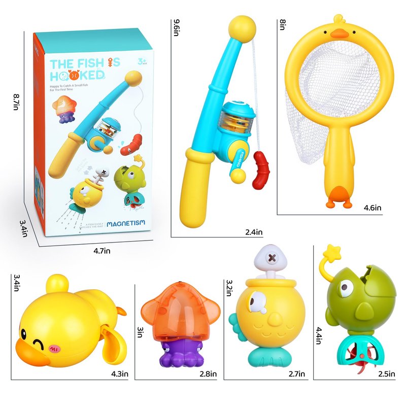 - 【Magnetic Fishing Bath Toys】This bath toy set for kids ages 1-3 contains 1 magnetic fishing rod, 3 different fish, 1 wind-up bath duck, and 1 fishing net to catch the animals. These simple yet fun water toy set for toddlers 1-3 are perfect for use in water tables, bathtubs, kiddie pools and beach, or even on the floor