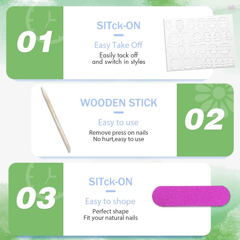2.Please note that the nail glue is not included.If you want it last for a longer time,please use nail glue instead of the nail stickers.