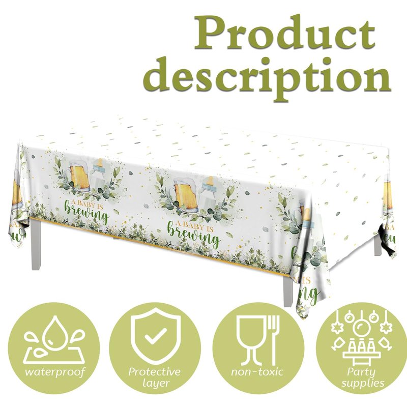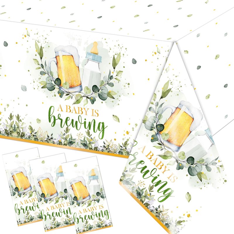 - đŒăMaterialăThe baby shower tablecloths beer are made of plastic material. The a baby is brewing baby shower tablecloths are waterproof, safe, reusable, not easily faded or broken. This beers and bottles baby shower tablecloth can protect your desktop from scratches.