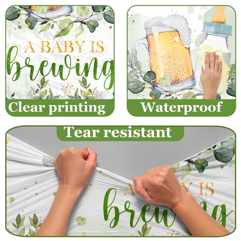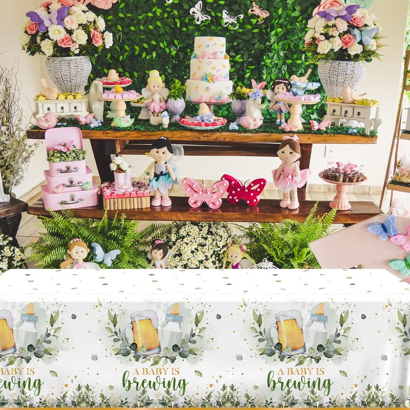 - đŒăCreative Designă The baby is brewing baby shower decorations are printed with many cute patterns, which can add a happy and exciting atmosphere. The baby shower decorations for boys and girls are printed with beer, leaves, feeding bottles, and the words 'A Baby is Brewing'. The baby shower brewing table covers decorations are a wise choice for girl or boy baby shower parties and will leave a lasting impression on the party.