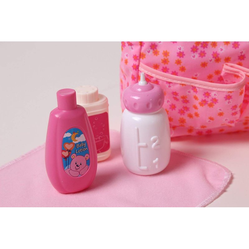 - This incredible gift set includes everything your daughter needs to take care of her pretend baby and she can fit it all inside of the cutest pink and floral tote bag: 2 baby bottles, 2 pink and blue burp clothes, a pink pretend baby lotion and one white pretend bottle of baby powder! Your child can arrange all her accessories on the outer pockets just like mommy’s diaper bag. DOLL NOT INCLUDED