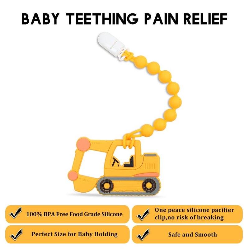 Baby Food Grade Silicone Carrier Vehicle Teether Toy with One Piece Design Pacifier Clip Holder,Teething Pain Relief Toys Gift Set for 3 Months+ Boys and Girls,Freezer Safe,BPA Free. (Excavator)