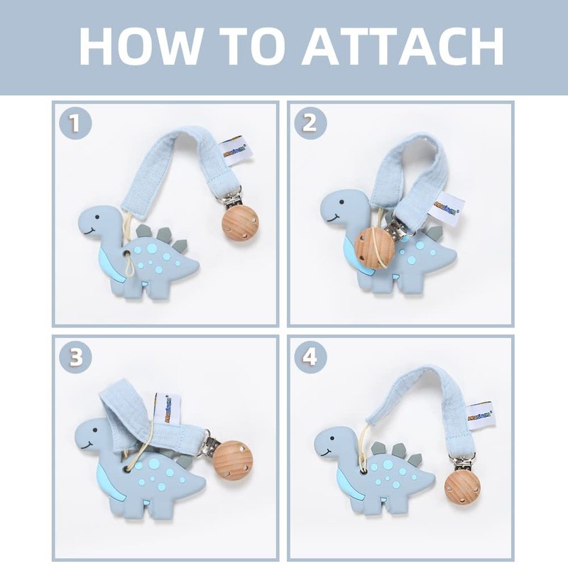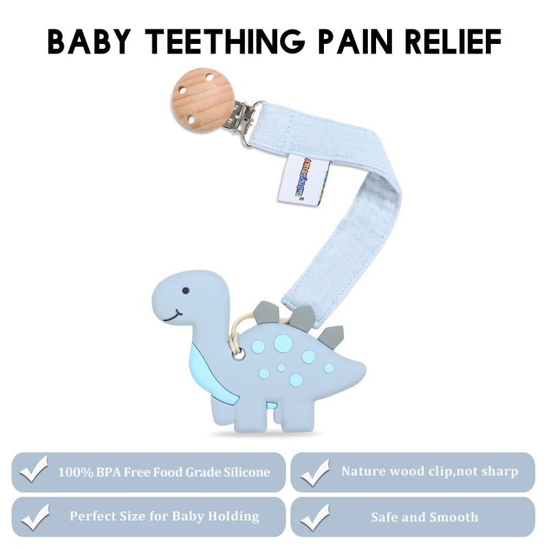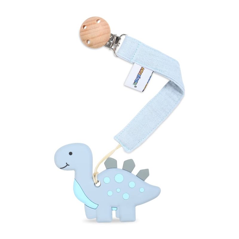 - Convenient: Our dinosaur teether is perfect size and easy-grasp design for baby to hold,pacifier holder is perfect length for clipping on baby clothes, blankets, toys, strollers, or car seats.
