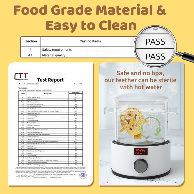 - Food Grade Soft Silicone - Teether toys is BPA free food grade silicone, which is easily cleaned with diswasher or handwash.