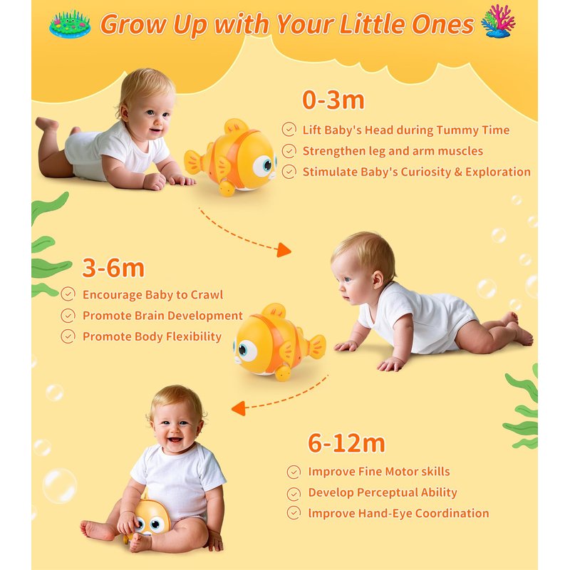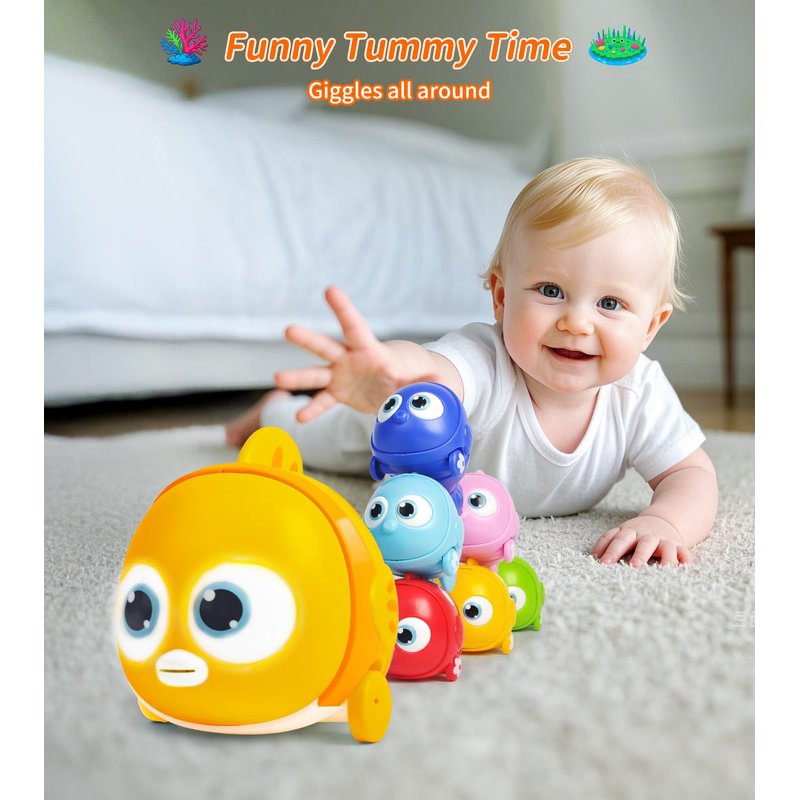 - ENCOURAGE BABY TO CRAWL: The fish's captivating lights and music prompt tiny tots to move and pursue, inspiring them to explore and develop their crawling skills. Witness your baby's excitement as they crawl with glee!