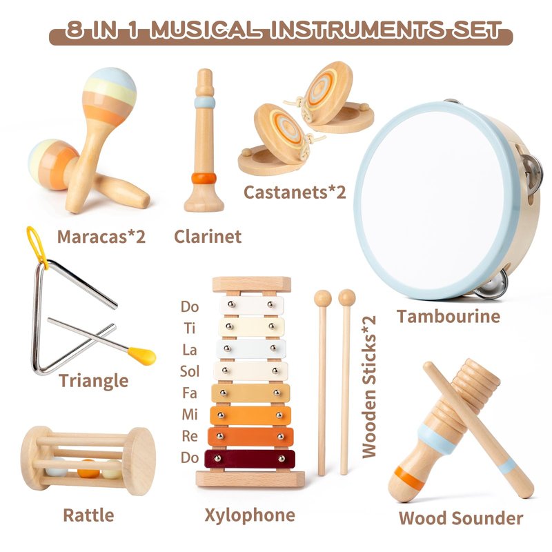 - Montessori Kids Musical Instruments: Our musical instruments for kids ages 5-9 is the best baby wooden toys for kids 3+. This set of toys features neutral tones and a timeless wooden design, making it both fashionable and suitable for any game room or nursery decor. Toddlers can develop fine motor skills, enhance attention, and improve hand-eye coordination by using the musical instrument set to tap and shake