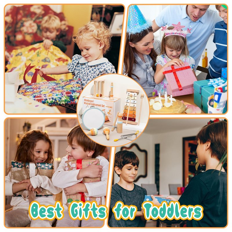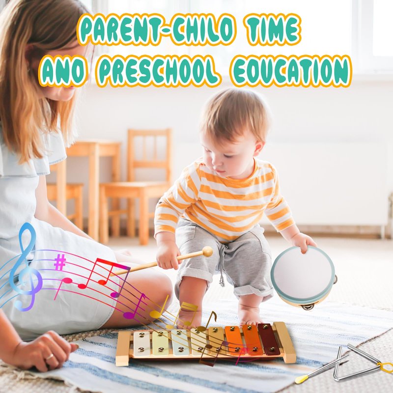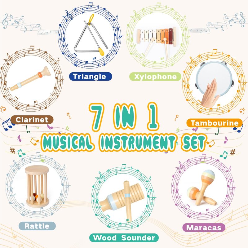 - 【Toddler Montessori Musical Instruments Set】This adorable toddler music toy set is arranged in warm and welcoming colors includes an 8-tone xylophone with mallets,Triangle with striker,two maracas,Tambourine,wood sounder,Clarinet,Wooden Rattle Roller,expose your mini-musician to different tones,volume, and rhythm.Every melody played is sound as harmonious as it is pleasant,the perfect introduction for young musical learners!