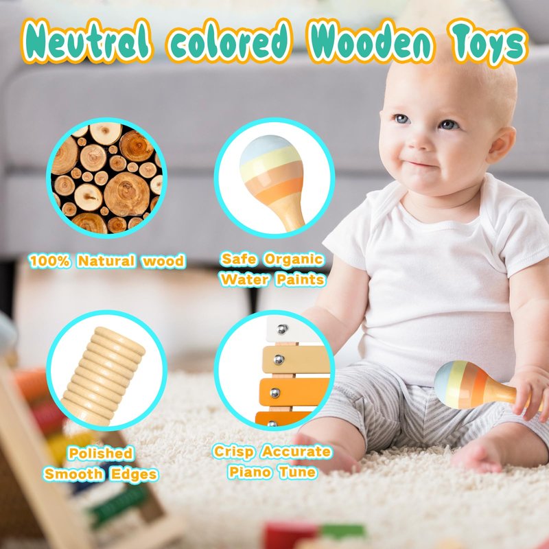 - 【NEUTRAL COLORS】Our musical instruments toy set features neutral colors,appealing to minimalist parents who prefer natural-looking toys for their children.These montessori wooden toys can keep baby focused and calm,improving children's concentration.This set of toys features neutral tones and a timeless wooden design, making it both fashionable and suitable for any game room or nursery decor.It goes with all of the boho baby toys,gender neutral baby items,neutral baby stuff and aesthetic baby toys.