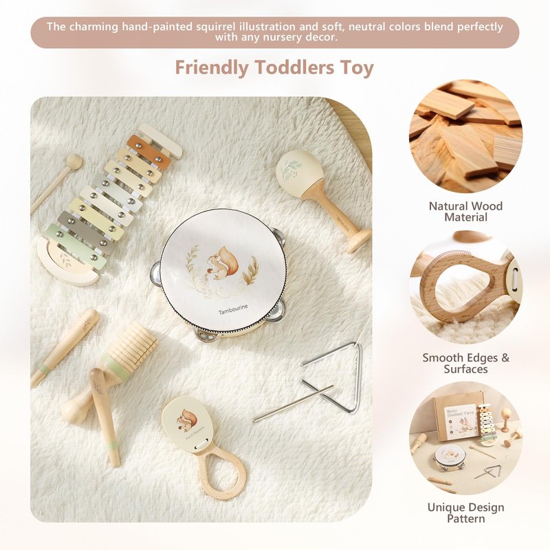 - 🐿️Attractive Design: Different from ordinary musical instruments, let's make musical instruments set features charming hand-painted squirrel illustrations, and soft neutral colors blend perfectly with any nursery decor. The unique design makes music more attractive and inspires your toddler's musical journey!