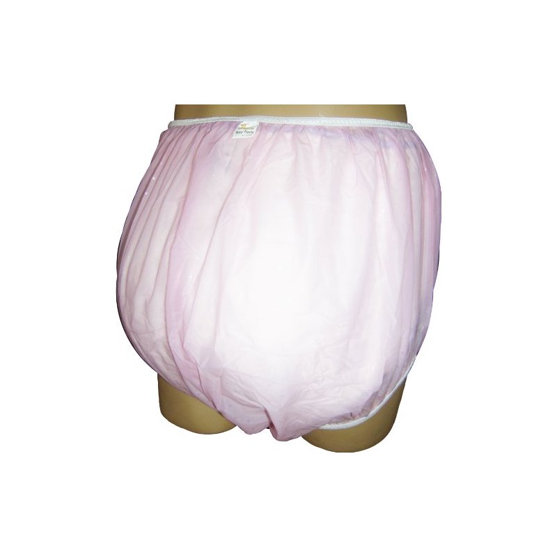 These are Pink Stars plastic baby panties, a semi translucent pink plastic with embossed stars and dimples which give it a wonderful texture. This plastic is approximately 4 gauge and is soft and supple; very comfortable to wear. They are very reminiscent of the Gerber baby pants of the 50's. These are high quality panties. The side seams are heat welded so there can be no leaks. These comfortable baby pants are worn over cloth diapers and are just as effective as the ones that little babies wear. The legs are forward facing providing plenty of room in the bottom area for doubled night diapers. The elastic is 3/4" but doubled around the edges of the plastic preventing the irritating pricks of the plastic so common in less expensive plastic pants.They have a wide crotch to accomodate the bulk of cloth diapers. They are cut generously so they can even cover your doubled night diapers. If you find it difficult to cover your diapers you probably need a size larger rather than "extended" backs. After all wearing diapers and plastic pants isn't a style show, they are to keep your pants and bed dry.