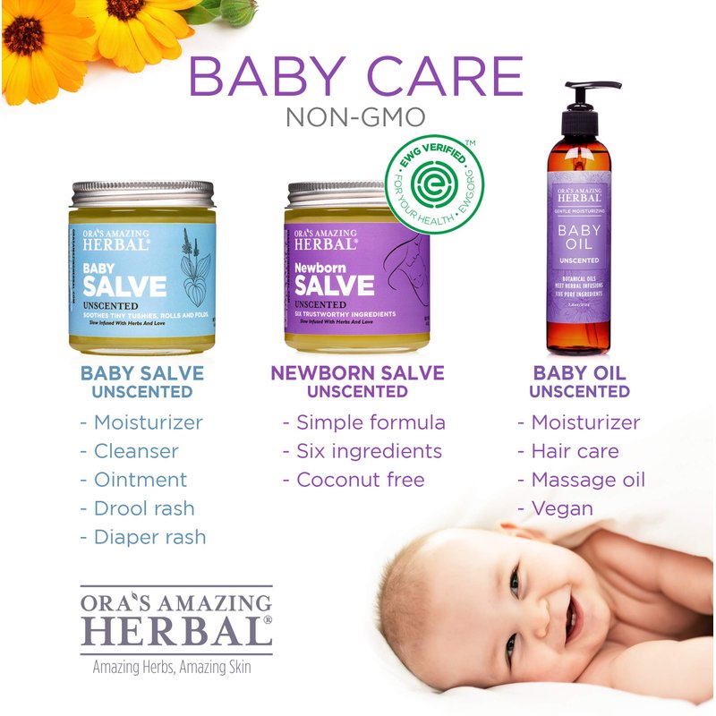 - ALLOVER OINTMENT and gentle ECZEMA CREAM FOR BABY. Avoid overbathing and maintain baby skin health naturally by using a small amount of salve to wipe down areas that tend to collect debris and get irritated. Fat little necks, behind ears and knees, and various rolls and folds can be kept healthy and fresh with an occasional application of a thin layer of Ora's Amazing Herbal Baby Salve. Gently massage baby with salve and then gently wipe off excess with a soft cloth.