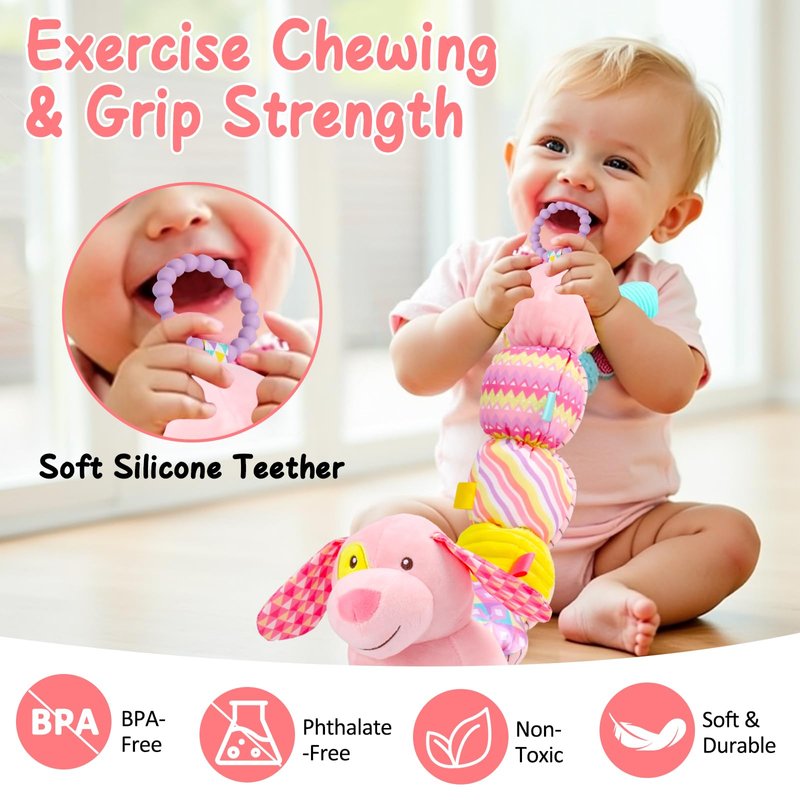 - Premium Infant Toys: The super cute long lasting dog plush is made from a non-toxic, odourless fabric that is easy to clean and reusable, durable with strong stitching, safe for children to play. There is no need to worry about babies biting or tearing the cloth stuffed dog. Ideal silicone teether ring as chew teething toys for babies 0-6 6-12 months. Infant essentials reassuring companion toy as baby's playpen toy, cradle toys and car seat toys 0-3 months